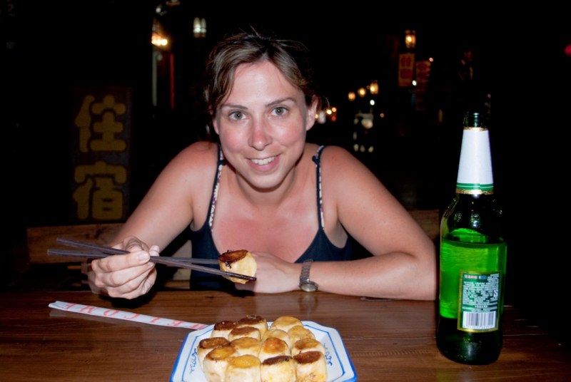Aprovechando que fuimos al hostal a recoger los billetes cenamos tranquilamente en él acompañados de una gran cerveza Tsingtao, el merecido descanso del guerrero.