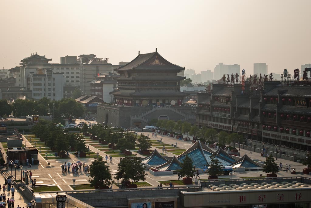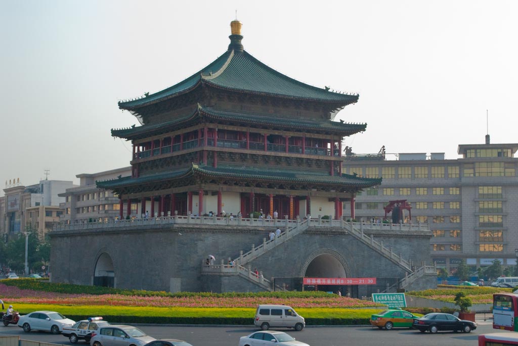 La primera de ellas data de la dinastía Ming. Es uno de los símbolos de Xi’an y se encuentra en el centro geográfico de la ciudad, ya que de ella parten las principales avenidas. Está situada una de las rotondas más caóticas que he visto en mi vida: muchísimo tráfico, coches y motos parados en medio, los carriles sin marcar (3, 5, 10?), gente haciendo footing… Afortunadamente y para no jugarse la vida, tiene un paso subterráneo por el que se accede. Anteriormente parece que estaba situada en otro lugar pero fue movida y situada en el actual por alguna razón que desconozco.