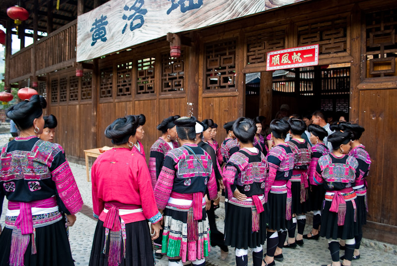La excursión comienza con un alto en la aldea de Huang Luo, antes de comenzar el ascenso a las terrazas, donde como en todo buen tour chino que se precie te ofrecen un extra a la excursión: Baile típico comida incluida. El pueblo está habitado por una de las minorías étnicas chinas, los Yao, cuyas mujeres visten con ropas coloridas y llevan su pelo extremadamente largo y recogido en la cabeza. Dicen que debido al agua con la que se lavan el pelo nunca tienen canas. ¿Y los hombres? pues la verdad no me acuerdo de ver ninguno…