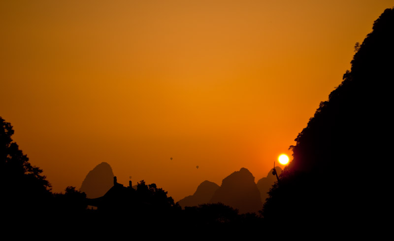 ByEl sol apenas se levantaba sobre las montañas que rodean Yangshuo a la hora que nos levantamos. A lo lejos podían verse los globos (que tan caros nos habían parecido) sobrevolando incluso el mismo sol, la vista debe ser escalofriante, pero la agenda ya estaba bastante apretada como para añadir una actividad más…