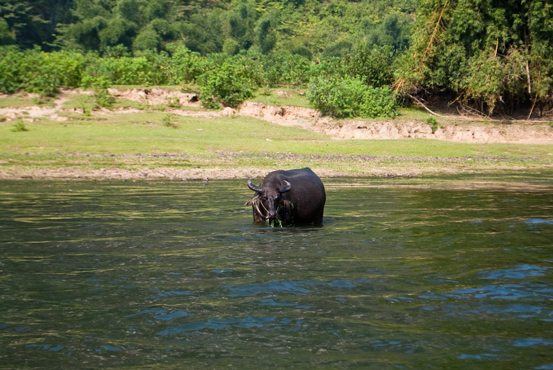 Vas cruzándote con otras balsas, que a esas horas van todas vacías, y algún que otro habitante de la zona que increíblemente va navegando sobre tan solo cuatro troncos de bambú. No hay mucho más, ni templos, ni curiosidades, tan solo el paisaje: las montañas y el río, que aunque parezca poco fueron lo suficiente para no parar de hacer fotos durante un buen rato.
