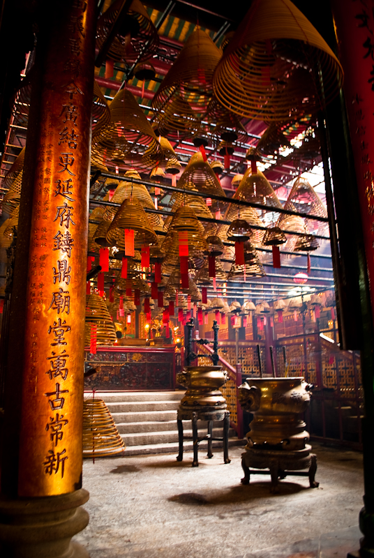 Entre los gigantescos edificios también puede encontrarse algún templo como el de Man Mo, que te transporta tan solo al entrar a una China quizá más reconocible. Aunque no es muy grande, el ambiente que crean sus espirales de incienso hace que te relajes un poco del traqueteo de la ciudad. Un pequeño paréntesis para que la ciudad no te absorba.