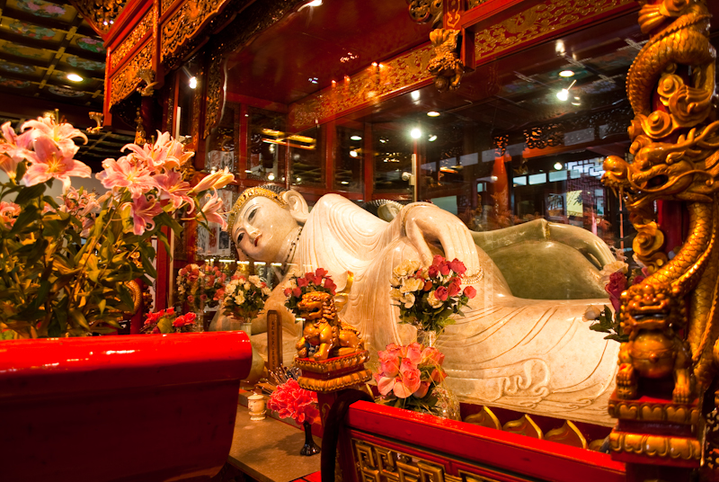 En otro edificio se encuentran los Budas que dan nombre al templo. El primero es un buda recostado. El segundo se encuentra en un piso superior, en una habitación dedicada tan solo a él. Es un Buda sentado de casi dos metros y con incrustaciones de piedras preciosas, aunque por desgracia no está permitido sacar fotos. Ambos Budas están realizados en una sola pieza de jade blanco y el Buda sentado llega a pesar 3 toneladas.