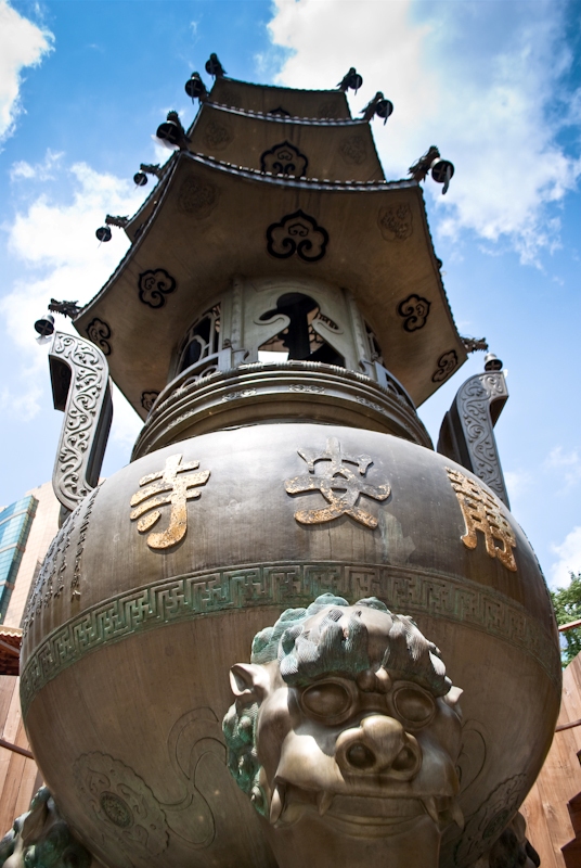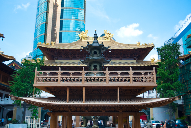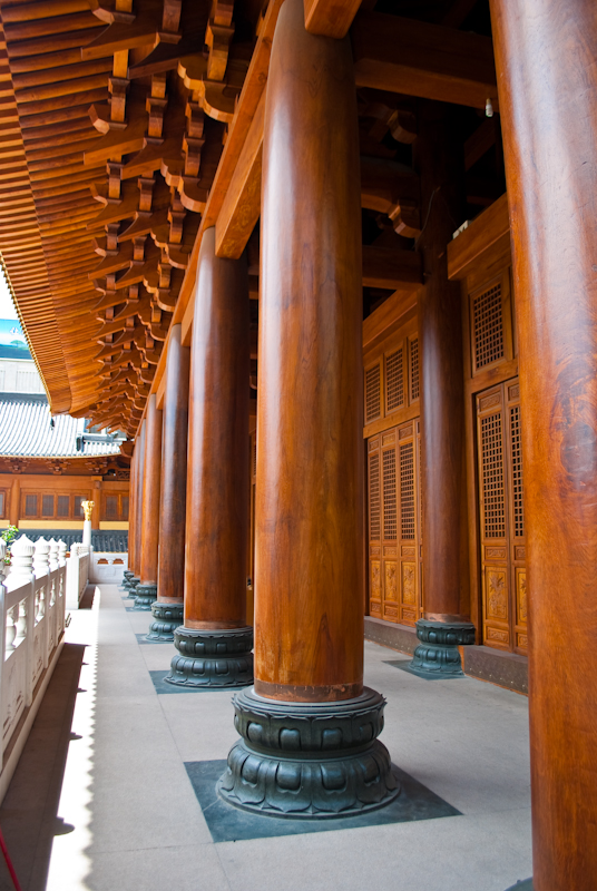La segunda visita del día, el templo Jing’an también se trata de un templo budista. Es considerado el templo más viejo de la ciudad (fue construido en el año 247, durante el periodo de los tres reinos), aunque durante su vida ha cambiado de localización e incluso pasó a ser una fábrica de plásticos. El templo actual data de 1983, lo cual explica su aspecto. Es un templo realizado principalmente en madera, sin pintar, y con elaboradas tallas. Nos tocó verlo con obras de restauración, por lo que algunos de los edificios estaban cerrados y otros cubiertos de andamios, aún así la diferencia de dicho templo con el resto visto hasta entonces era palpable.