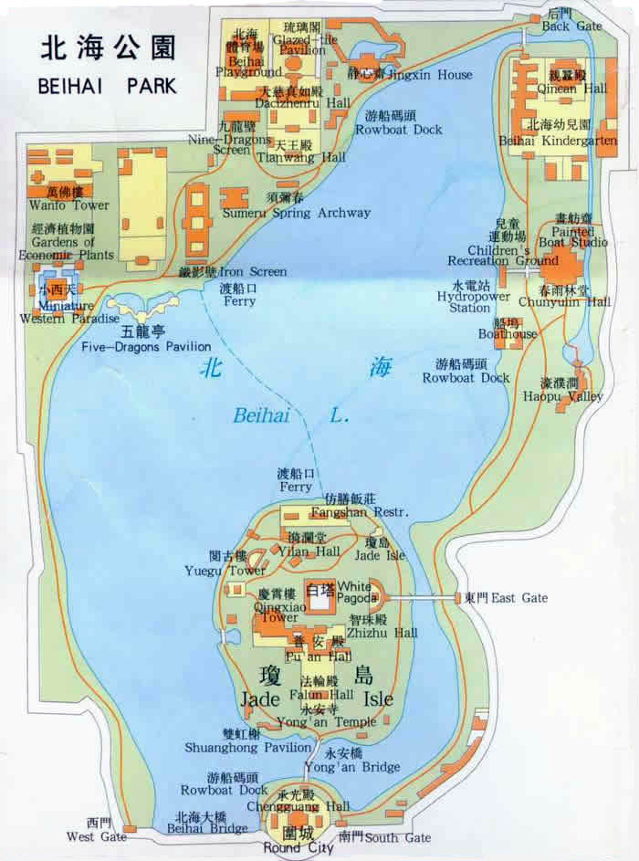 La entrada al parque se paga según las zonas que se quieran visitar, entre las cuales están el propio parque, la Ciudad Circular y la zona de la Dagoba (o pagoda) Blanca. Fue construido durante la Dinastía Liao y es uno de los parques con más historia con sus más de 1.000 años de antigüedad. Con unos 0.7Km2, la mayor parte está ocupada por el lago, en el cual se encuentra el Islote del Jade Floreado, principal atracción del parque.