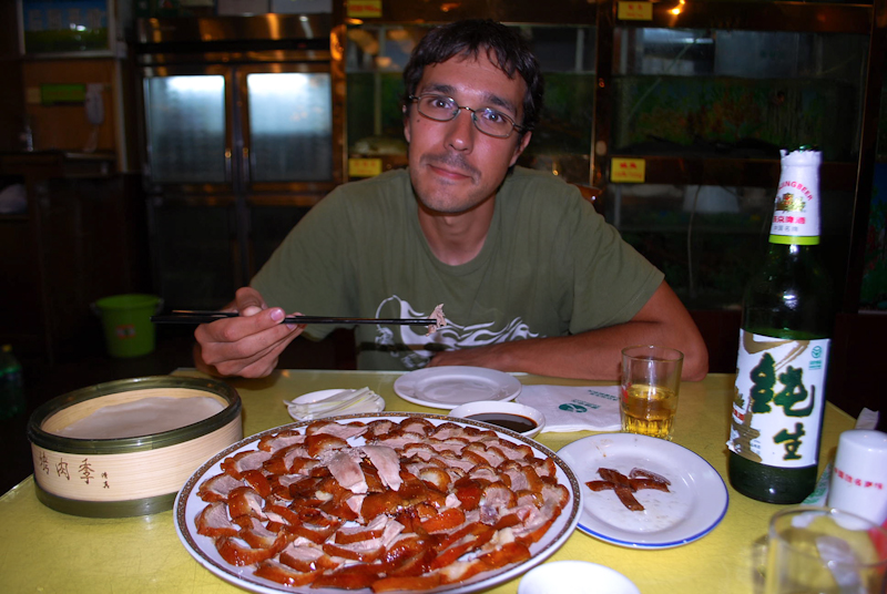 Aprovechamos el lugar para tachar de la lista de «musts» en China: el comernos un Pato a la Pequinesa (o pato laqueado) (Por concretar algo, un pato laqueado entero para dos personas más bebidas fueron unos 120 Yuanes). Simplemente espectacular, incluso te cortan el pato junto a la mesa. Una forma inmejorable de terminar el día.