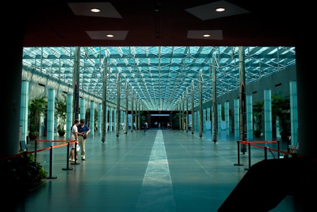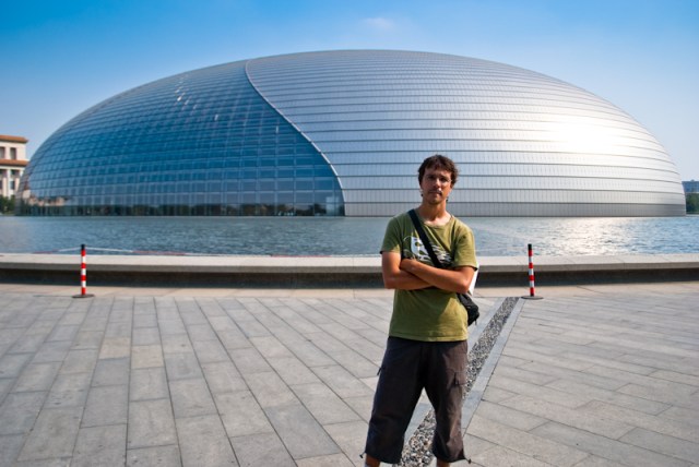 Comenzando por la plaza Tian’an Men o frente a la ciudad prohibida nos dirigimos al oeste, para ver un gigante OVNI que resultó ser el Centro Nacional para la Artes Escénicas. Un edificio muy novedoso, aunque teniendo la Ciudad Prohibida tan cerca quizá destaque demasiado. Magnífica me pareció su entrada, ya que el edificio está completamente rodeado de agua y la entrada es subterránea, a través de un pasillo con un techo de cristal bajo el mencionado agua, a través de la cual entra la luz. No llegamos a entrar a verlo, pero habría estado bien si hubiéramos tenido tiempo y habría coincidido que hubiera algún espectáculo.