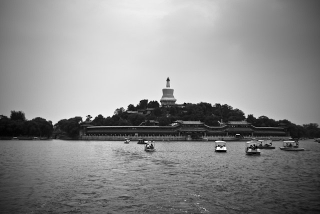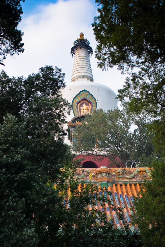 La Dagoba de origen tibetano fue construida por el emperador Shunzhi en el año 1651 para así mostrar su creencia en el budismo y con la intención de unificar las diferentes etnias de China. La estupa tiene unos 30 metros de altura, y al estar situado en el punto más alto de la isla la hace ser visible desde gran distancia. A su vez, desde lo alto de la colina se pueden observar otros puntos cercanos como son la multitud de tejados de la Ciudad Prohibida o el cercano parque Jingshan (al que no pudimos ir por falta de tiempo, y desde el cual seguro que hay una vista espectacular de la Ciudad Prohibida).