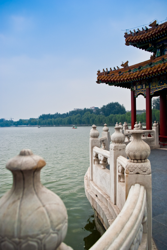 Tras visitar el islote hay dos opciones. Volver por donde has venido y recorrerte el resto del parque o tomar un barco hasta la otra orilla. Optamos por la segunda (ya era bastante tarde). El barco te deja en un salto cerca del Pabellón de los Cinco Dragones, zona donde se junta gente a cantar (teclado, micro y altavoz incluidos), tocar instrumentos o bailar, resulta interesante pasarse por ahí. Aconsejo también darse un paseo por los alrededores, para ver los diferentes edificios en los cuales se puede encontrar por ejemplo otra de las copias del mural de los 9 dragones (visto también en la Ciudad Prohibida).