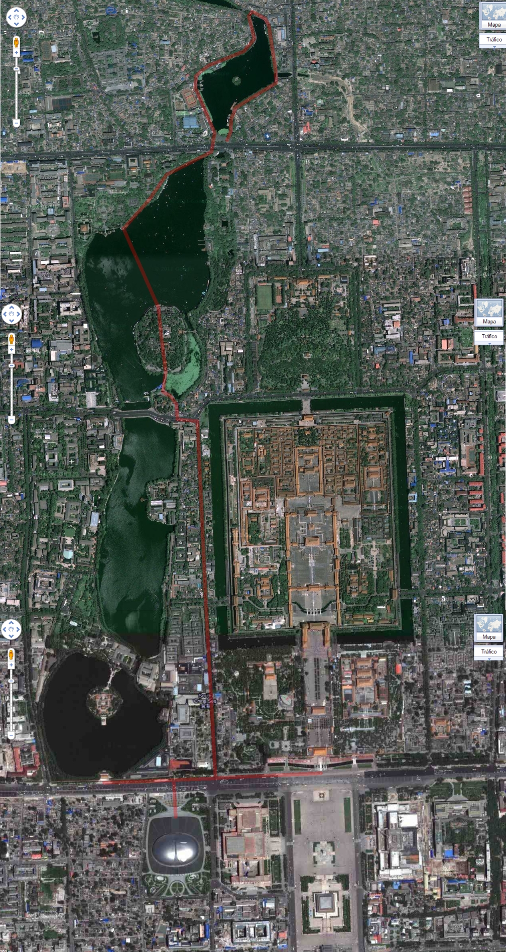 Total, que seguimos nuestro camino hacia el parque Beihai por la calle lateral a la ciudad prohibida y es entonces cuando te das cuenta de lo grande que es, ya que el paseíto son unos cuantos minutos. La calle está muy bien, ya que aunque es céntrica, las casas son bajitas, tipo hutong y hay mucha vidilla, aunque también bastante tráfico.